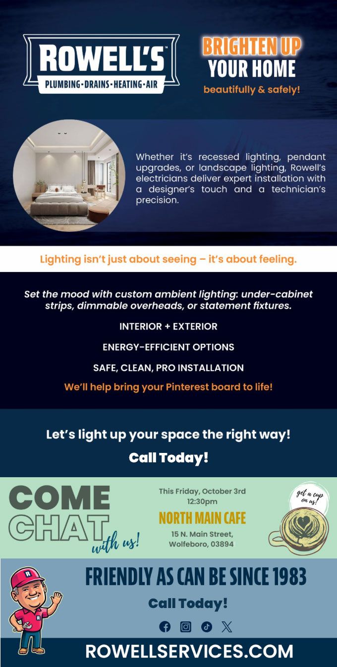 "Friendly As Can Be Since 1983!" When you need help with your plumbing, drains, heating, cooling or electrical in Waterville Valley, you can always rely on Rowell's Services! Call us now or book online!