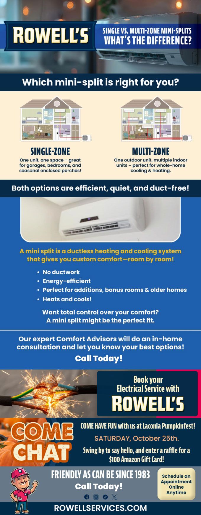 "Friendly As Can Be Since 1983!" When you need help with your plumbing, drains, heating, cooling or electrical in Waterville Valley, you can always rely on Rowell's Services! Call us now or book online!